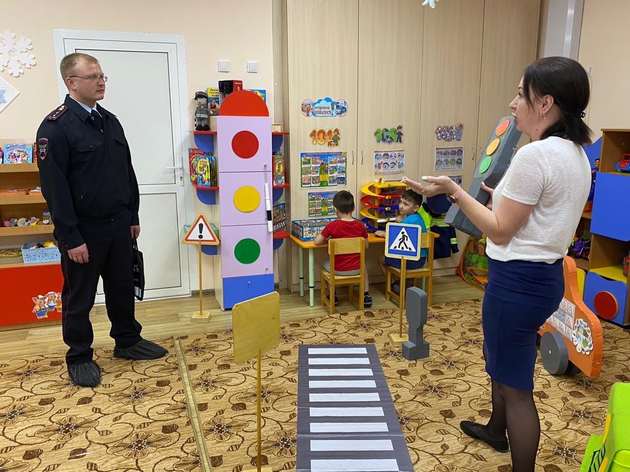 После небольшой экскурсии по детскому саду госавтоинспектор провел для ребят интересную беседу по правилам дорожного движения. Ребята смогли в игровой форме повторить вместе с сотрудником полиции основные правила поведения на проезжей части, а также узнали требования дорожных знаков.
